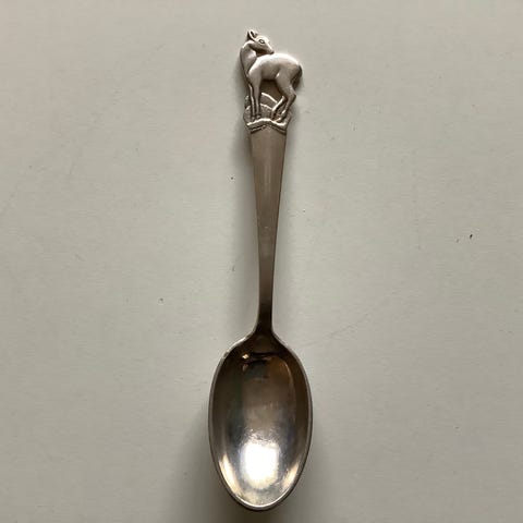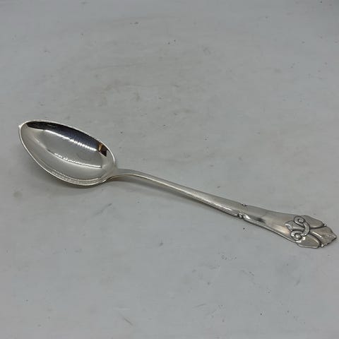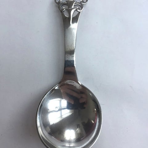 Vintage barneske, ukendt mærke i pletsølv med stempel P DGS 30. Messing belagt med sølv. Smuk udformet skaft. Vejer 26 gram, 14,5 cm