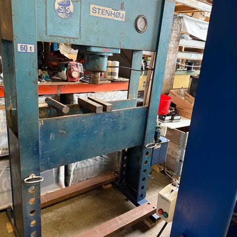 Kallesøe maskinfabrik hydraulisk presse i stålkonstruktion. Maskinen er opbygget som en større ramme med flere lodrette søjler og tværbjælker. Den er udstyret med hydraulikpumper, manometer og tilslutningsslanger til styring af tryk. Presseenheden er egnet til industrielt brug, f.eks. til presning, samling eller limning af emner i træ eller andre materialer, afhængigt af opsætning og tilbehør. Maskinen kræver fast installation og tilslutning til el og hydraulik efter gældende forskrifter. Der er en cylinder som er lidt utæt. Har ikke været brugt længe.
