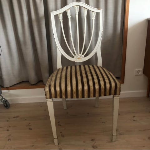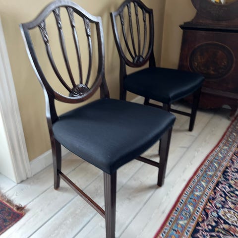 Hepplewhite SPISEBORDSSTOLE JENSEN FARRE NR 1, - DANSK, højeste kvalitet. har 2 stk. OBS samt et sæt på 6 stole med ens betræk. Nok den flotteste Hepplewhite spisestue, der er lavet. Prisen er for EN stol. Betræk på sædet trænger til rensning. Prisen er fast..