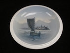 Flot stor bordskål fra Royal Copenhagen med motiv af en smakjolle ud for Kronborg.