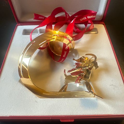 Georg Jensen forgyldt juleuro fra 2002 forestillende en pige på julebuk. Den er designet af Finn Næss-Schmidt og der følger original æske og bånd med. Jeg sender gerne godt indpakket mod betaling af porto kr. 50.