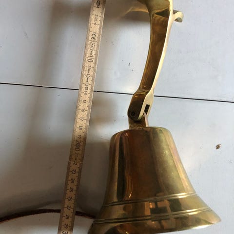 Vægklokke, Støbejern vægklokke. Den har en rigtig god klang. Flot motiv på siden. Diameter 11 cm. Længde fra beslaget til hånd grebet 40 cm. Pris 400 kr. Se også mine andre annoncer. Hv123