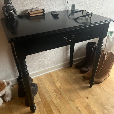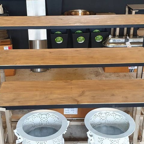 Andre borde, Enkelt og elegant designer konsolbord bestående af et jernstel lakeret i en flot gylden farve med 3 ovale, sorte glasbordplader på. Det fine og høje konsolbord har disse smukke, klassiske sorte og gyldne farver, der aldrig går af mode. Smukt anretterbord af det lækre interiørmærke Nordal. Det gyldne Nordal bord er 116 cm langt, 39 cm dybt og 81 cm højt. Prisen på nettet ligger mellem 4000-4700 kr. Jeg har sat prisen ned til 1000 kr og det er min absolutte smertensgrænse prismæssigt.