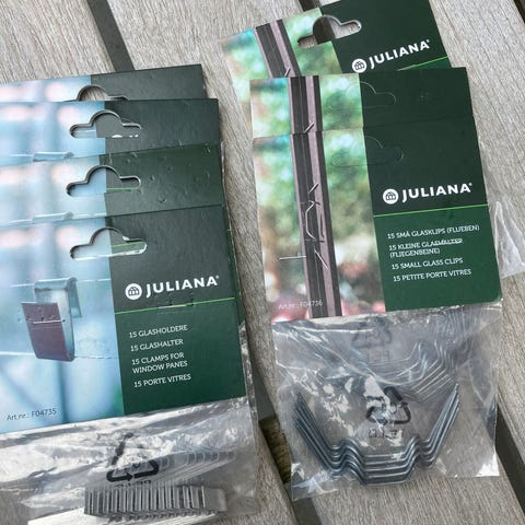 Tilbehør, 4 poser a 15 stk. glasklips/flueben i uåbnet pose.