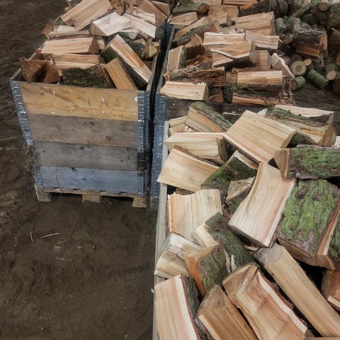 Lærk, 2,2 rm, Tørt lærkebrænde. Max 28 cm. Leveres på tiptrailer der kan rumme 2,6 ksrm (ca 2,2 RM).