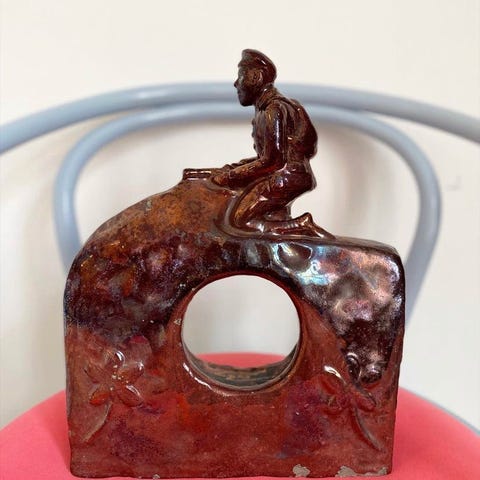 Jagende Tiger, Jens pedersen/Søren Kongstrand, 1930, Flot stor figur signeret af Jens Pedersen JP. Fra Esbjerg. Jagende Tiger . Der er et afslag bag på figuren . Længe = 47 cm Dybde = 28 cm Højde = 19 cm . Meget flotte farver.