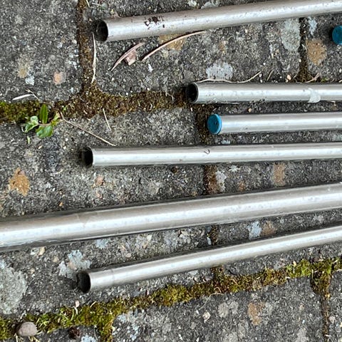 Stålrør, Galvaniserede Ø75 x 5 mm Er fra nedtaget badebro, så derfor er der lidt rust på nogle af dem.
