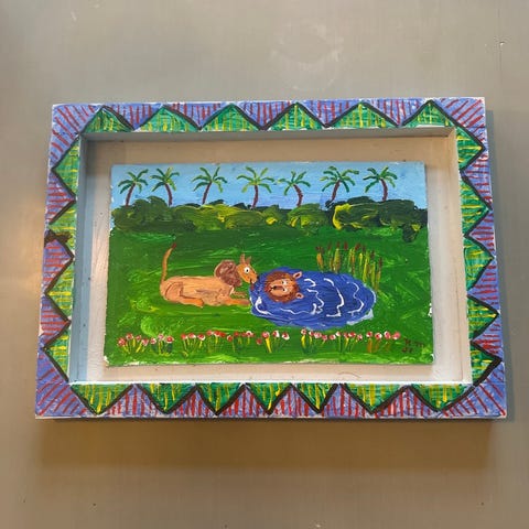 Akrylmaleri, Ib Meyer, motiv: Dyr, stil: Andet, b: 19 h: 24, Naivistiske kunster Ib Meyer Har lavet en række dyrebilleder med egne malede rammer