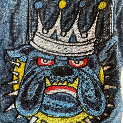 Ed Hardy by Christian Audigier designer jeans med bulldog. Str 4 år ca. str 98/104. Indv. benlængde. ca. 42 cm. Slim fit. I flot stand. Nyprisen var 599,-