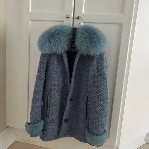 Smuk overgangsjakke fra Oh! By Kopenhagen Fur med lyseblå kant hele vejen rundt og minkpels på ærmerne. Kun brugt få gange.
