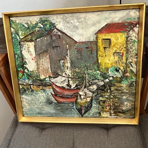 Oliemaleri, SARAH H(N)UGG, motiv: Abstrakt, stil: Modernisme, b: 59 h: 70, FLOT BILLED FRA MILJØGÅRDEN NORGE AF SARAH H(N)UGG.