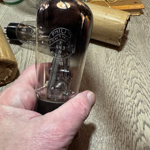 Philips EL41 elektronisk rør til brug i lydudstyr og forstærkere. Produktet er fremstillet af glas og indeholder interne metalkomponenter. Velegnet til reparation eller opgradering af kompatible enheder.