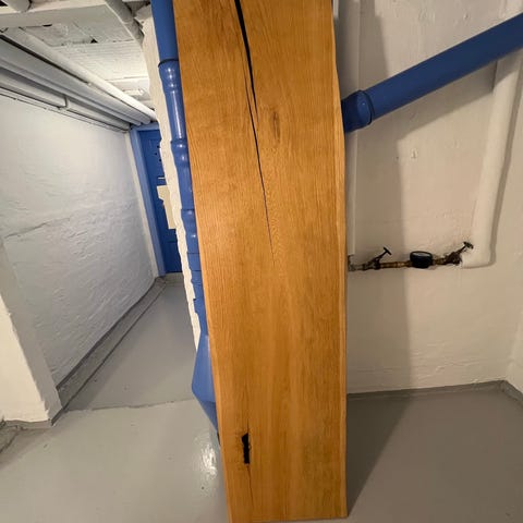 Planken har gennemgået en grundig tørringsproces: 1 år udendørs, 2 år i en container og 1,5 år i et opvarmet værksted.