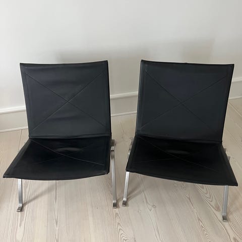 To stk PK22 Poul Kjærholm lounge stole fra Fritz Hansen med lyse, flettede sæder sælges. Dele af sædet på den ene stol trænger til reparation, hvorfor prisen på denne anvendes til annoncepris.