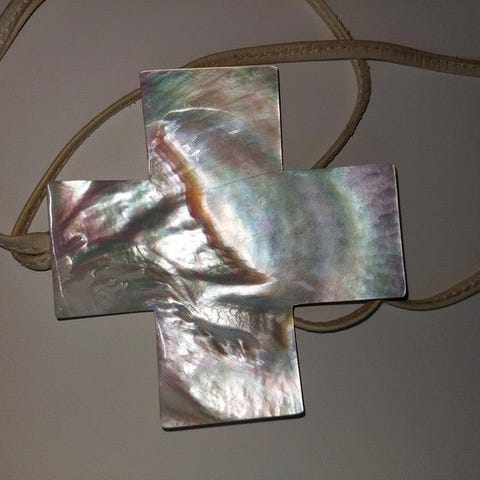 Halskæde, Ukendt, Unikt perlemors kors 11 x 11 cm med læddersnor på ca 42 cm x 2. Fejlfrit uden afslag.