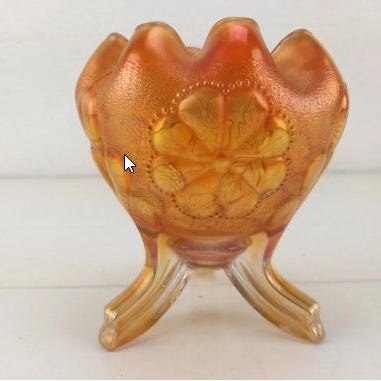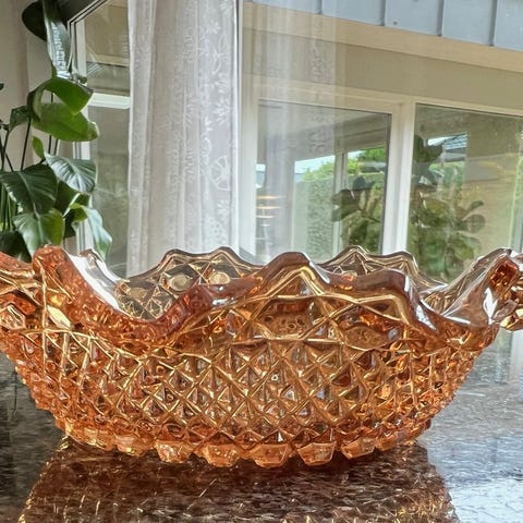 Glas, Skål med bølget kant og han, Fyns Glasværk, Carnival, Skål i orange glas, skål med "flæser" og hank