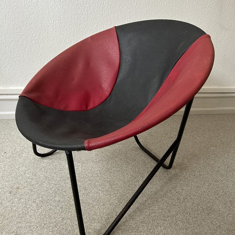 Fletstol, metal, Grydestol i jern og flet - original 1950'er design, Alt efter barnets højde: 1 - 6 år. H-ryg: 40 cm. H-sæde: 20 cm. Dia: 41 cm. Stol i originalt 1950'er retro design i patineret jern med orange og sort originalt plast-flet. Grydestol i jern og flet. Børnestol - fletstol – loungestol – lænestol. Kontant ved afhentning.