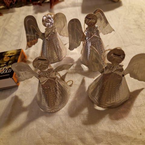 Et helt retro englekor, udført i folie i farverne guld, lys rød og blå, De er alle i flot stand. De kan evt. hænge eller stå til pynt. Jeg sender gerne godt indpakket mod betaling af porto kr. 50.