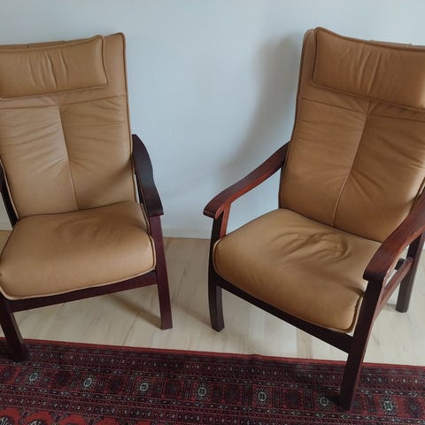 Anden arkitekt, Farstrup , Hvile stole, To fede stole fra Farstrup. Lakeret eg, som jeg ser det. Betrukket med uld Hallingdal 687. Højde ryg 108. Bredde 72. Sæde dybde 50 cm. Siddehøjde 42. Kan justeres tilbage i ryggen. Har et et par små huller i betrækket der uden det store kan repareres Ta’ dem som de står til en yderst attraktiv pris. Set til 2500,- stk. andre steder. SAMLET PRIS. Se mine øvrige annoncer for mange spændende ting