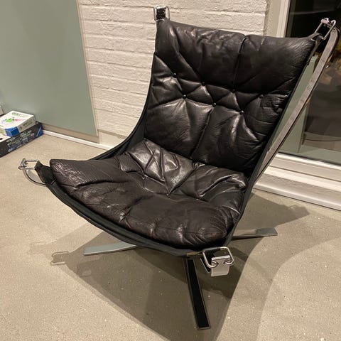 Anden arkitekt, Falcon, Stol, Sigurd Ressell stol med fod skammel. Producerer af Vatne Møbler i periode brugsspor. Den er med høj ryk. Sort træ og stål beslag.