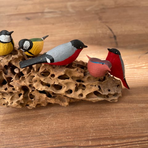 Træfigurer, Fugle, Siddende fugle 15 cm høje. kr 50,-/stk. (1305)