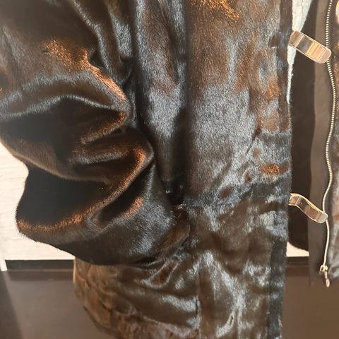 Har også super smuk langhåret sort minkpels, smuk jakke i kaninpels brun, en grå kort pels (stor str.), pelsveste og mange læderjakker og andre jakker.