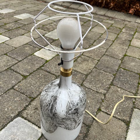 Lampen er hvid, med dekorationer i sort/grå nuancer.
