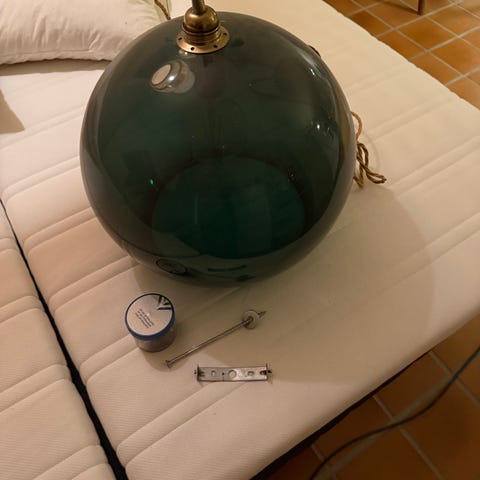 Lampens glasskærm er 51 cm høj og 21 cm Ø