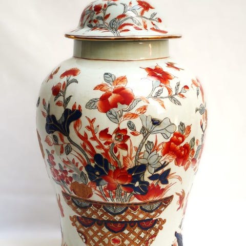 Wong Lee Art Nouveau Stil Krukke I Messing Ramme, Smuk art nouveau stil Wong Lee messing indrammet krukke eller kiksespand i porcelæn.