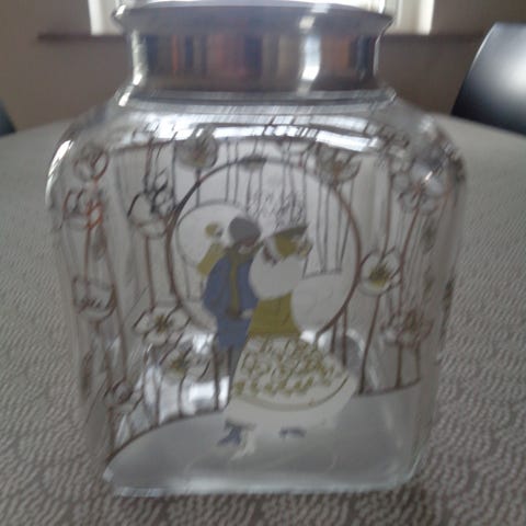 Holmegaard Jule kageglas, 2010. Design Jette Frølich. Højde 16 cm, bund 11,5x11,5 cm. Dia hul 7 cm. I rigtig fin stand. Fra røgfrit hjem. Forskellige motiver på alle 4 sider.