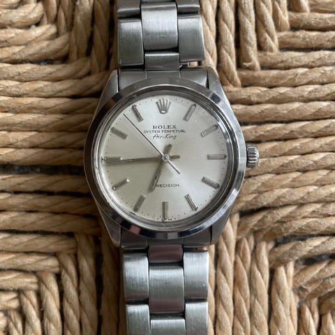 Her har vi et fantastisk vintage Rolex Oysterdate Precision! Dette smukke vintageur på 34 mm er fra 1970 og har en smuk skive i sølv.