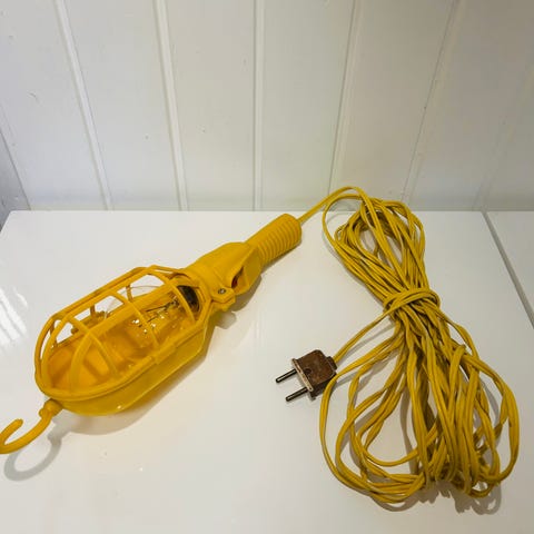 Anden loftslampe, Dora, 4 stk værkstedslamper eller arbejdslamper som har været brugt som normale loftlamper. De er købt i den lille designbutik Dora på Frederiksberg. Længden på ledningerne varierer. Lamperne totale længde inkl ledning: