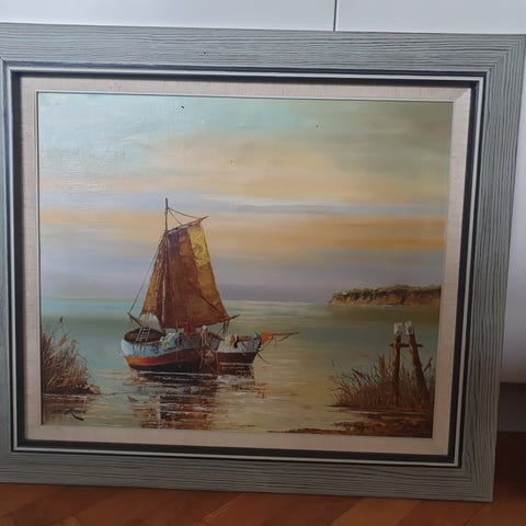 Oliemaleri, motiv: Andet, b: 111 h: 82, Flot skibsmaleri - der venter på en ny stue, hvor det kan lyse op.