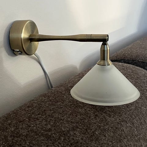 Pæn væglampe med hvid skærm i frostet/matteret glas. Bruger G-9 led pære.