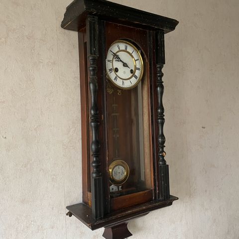 Antik vægur i flot stand fra røgfri hjem. Diameter 34 cm. Nøgle medfølger. Uret går fint, kan desværre ikke sendes. Men kan ved lejlighed fragtes til Hellerup.