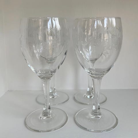 Flotte Luminarc France vinglas dekoreret med blomster og fugle rundt om glasset.