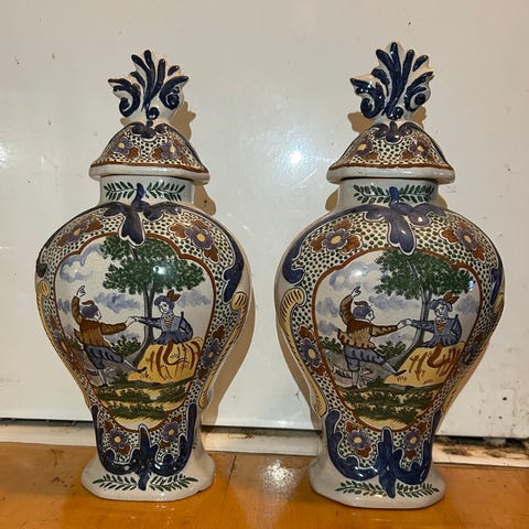 Kongelig Delft Porcelænsfabrik, fajance, 120 år gl., Et meget sjældent par antikke Delft kander fra De Koninklijke Porceleyne Fles med næsten ens maritime motiver og blomsterdekorationer.