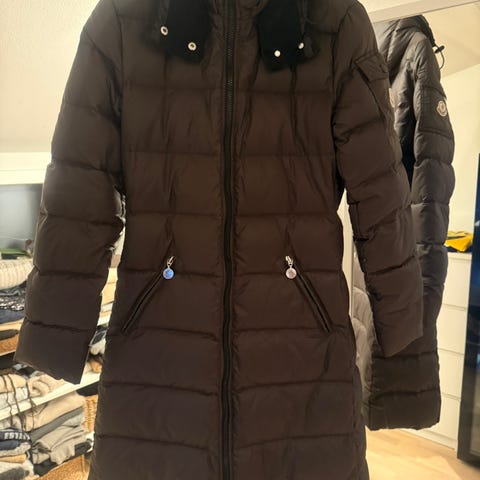 Frakke, str. 42, Moncler , Sort , Dun, Ubrugt, Sælger min fine moncler frakke str 4. Den er super flot m skrå lukning og uld krave. Elastisk stof m dun