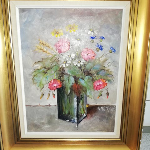 Glad og farvestrålende lille blomsterbillede malet på linoleumsplade.