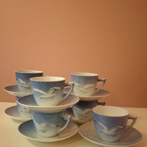 Porcelæn, Kaffekop, underkop og kagetallerkener , Bing & Grøndahl måge, 7 kaffekopper, 9 underkopper og 11 kagetallerkener