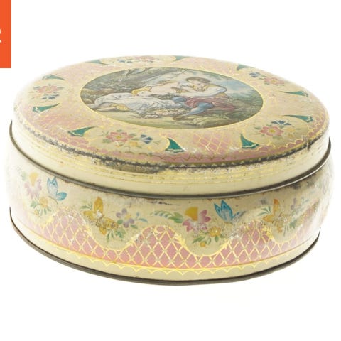 Sjælden flot stor oval “Lonka Old English Fudge sort caramel” blik dåse fra 1950’erne
