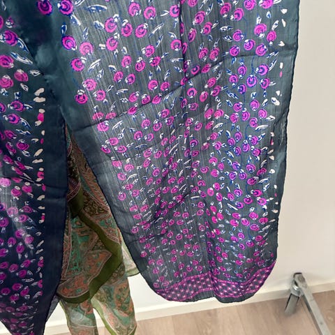 Tørklæde, Halstørklæde, Nitin Goyal - London, str. 240 x 35 cm, Mørkeblå, Silke, Næsten som ny, Lækkert langt tørklæde i støvet mørkeblå farve. Lækker silke kvalitet. Har smukt knyttet mønster på den ene side.