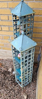 Unikke vintage reoler til ude, Gamle metal CD holdere der er omdannet til opbevaring og pyntemøbel til de små ting/planter i have og på terasse. De er begge malet og oxideret så de fremstår i vintage stil. Mål: Den høje 96 cm og den lavere 76 cm. 350 kr for begge.