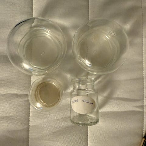 4. låg fra venstre: Dia foroven ca. 3 cm, dia forneden ca. 1,3 cm, højde ca. 3 cm