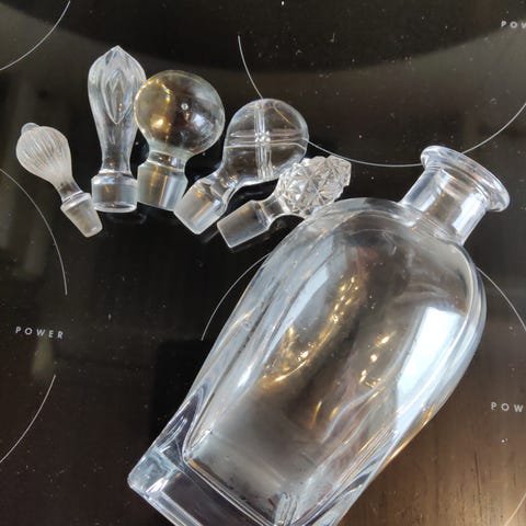 1 stk. flad mørkegrøn. Højde ca. 9 cm, bredde hvor den er bredest ca. 5,5 cm, tykkelse ca. 2,5 cm, dia forneden ca. 2 cm