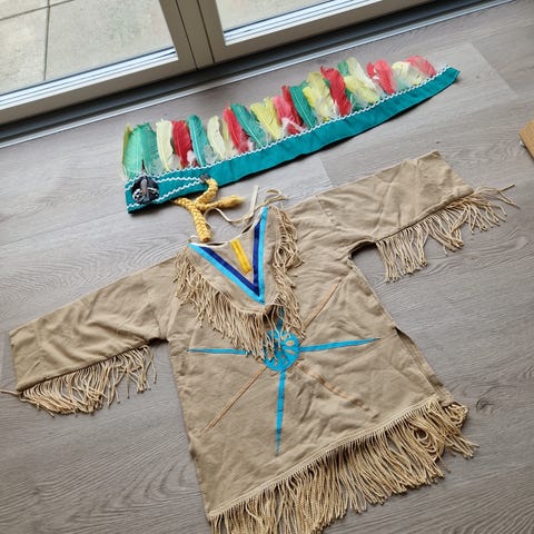 Snemandskostume, Snemandskostume brugt 1 gang, str. m/l. Der følger hat, paryk, tørklæde, gulerod i filt, snemandsjakke og snemands bukser med.