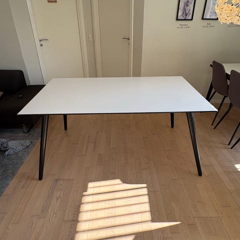Spisebord, Spisebord købt i Jysk for nogle år siden, men er ikke blevet brugt meget, dog forekommer der brugsspor. Købt som et sæt med stole med en nypris på omkring 1599,- kr.