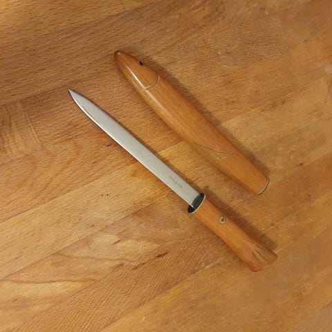 Fiskekniv , “K”, Fiskekniv fra “K”, bladlængde 20cm. Alt er intakt. FLYTTESALG fra et røg- og dyrefrithjem. Kan sendes.