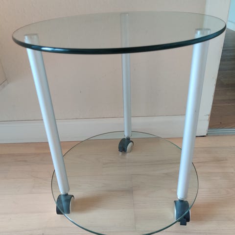 Glas/træ, Rundt sidebord med 2 glasplader og træ plade nederst. 64 cm i diameter.