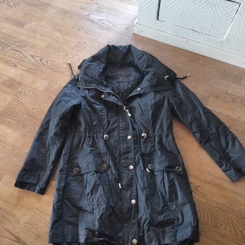 Style: Parka jacket. Full zip & button up. 2 outside zip pockets and 2 outside button up pockets. Small pocket on left sleeve with velcro closure. Zip pocket inside left chest and pocket on inside right chest also. Drawstrings on the bottom of the jacket.